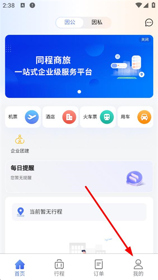 1、進入首頁可切換因公或因私模式,使用機票、酒店等出行服務功能,點擊我的進入個人中心,查看消費及服務入口。