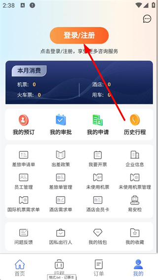 2、個人中心頁面,能看到本月消費統計及我的預訂、我的審批等功能選項,點擊登錄、注冊可解鎖更多企業差旅服務。