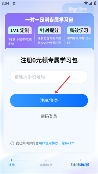 1、進入注冊頁,輸入手機號點注冊/登錄,勾選同意協議完成操作,注冊后0元領專屬學習包,該包針對成績定制、助力提分且耗時少。