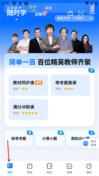 2、進入課程頁,可選教材同步課等課程,用練??碱}等練習功能,頁面顯示適配教材版本,便于匹配對應學科的學習內容。