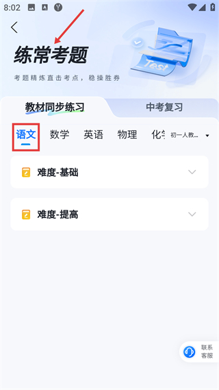 3、進入練常考題頁,切換教材同步練習或中考復習,選對應學科后設基礎、提高難度,便于匹配學習進度選練習內容。