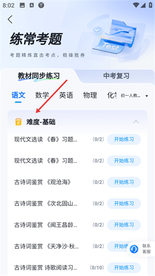 4、進入難度-基礎練習列表,查看對應學科練習,含現代文選讀等題型,點擊開始練習即可訓練,助力對應知識的鞏固。