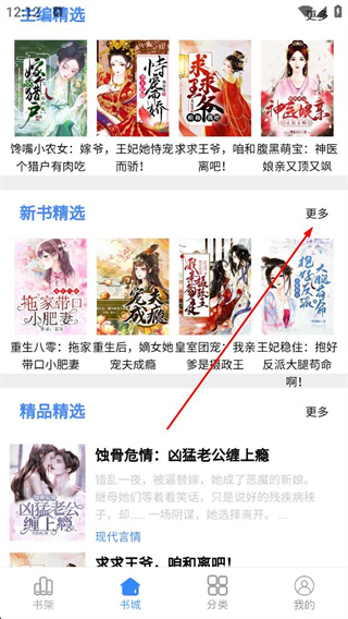 1、打開小說閱讀軟件,進入主界面后找到新書精選板塊,點擊更多按鈕,可查看更多新書內容,選擇感興趣的書籍條目進入詳情頁面。