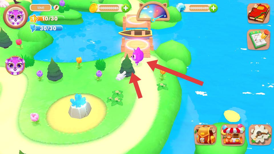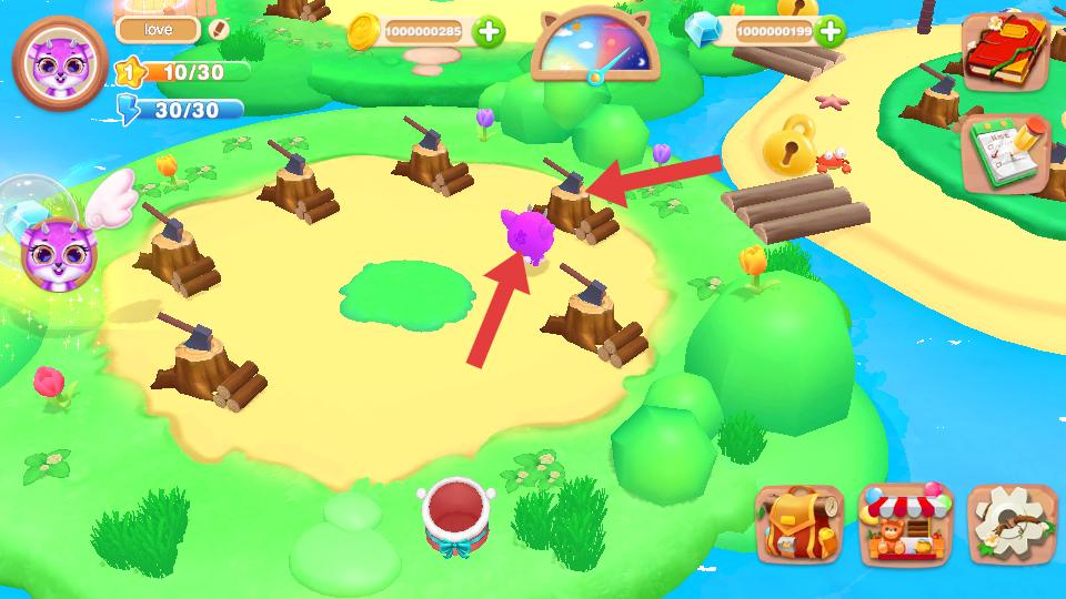 1、進入游戲,操控紫色萌寵在小島上活動,小島有樹樁等元素,萌寵可在區域內探索,開啟小島冒險之旅。