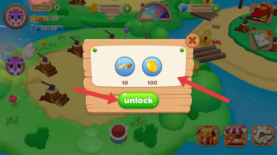 2、遇到需要解鎖的內容時,會彈出提示框,顯示需要的木材和金幣數量,點擊unlock,消耗資源解鎖新區域或物品。