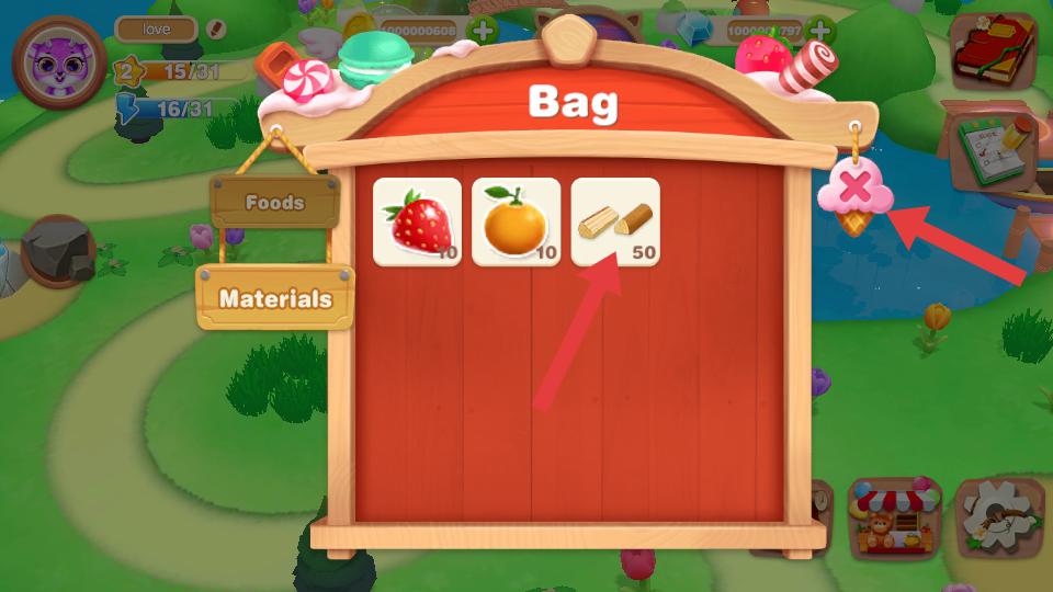 4、打開背包,可查看Foods和Materials分類下的物品,像草莓,橙子,木材等,合理使用這些物品助力小島探索。
