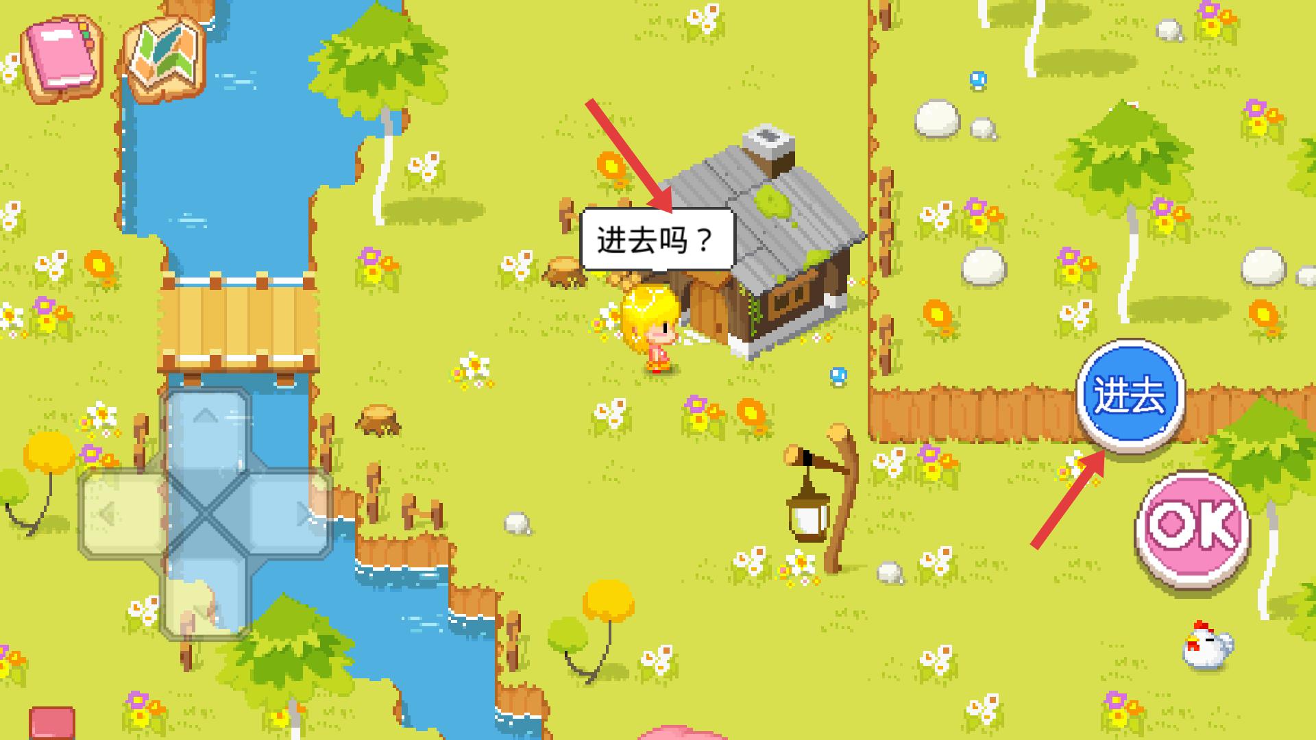3、當來到村長家小屋前,會出現【進去嗎】的詢問,此時點擊【進去】按鈕,就能進入村長家。