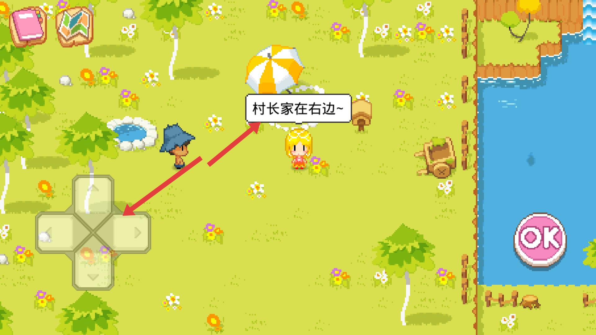 2、進入游戲場景后,會看到提示村長家在右邊,按照指引,操控角色往右邊移動,前往村長家。