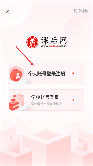 1、課后網登錄界面,可選擇個人或學校賬號登錄,背景簡潔,有切換地址功能,方便不同用戶根據需求進入系統。