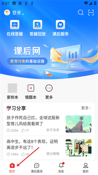 2、首頁有在線答疑、答疑回放、課后服務等功能,還有家校本、錯題本,以及親子關系、提分策略等學習分享內容。