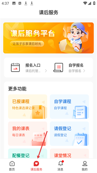 3、課后服務頁面頂部有卡通圖案及宣傳語,中部有報名入口等功能,下方更多功能涵蓋已報課程自學課程等多項服務。