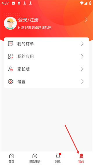 4、我的頁面,可登錄注冊,能查看我的訂單、我的應用,還有家長版及設置選項,方便用戶管理個人相關內容。