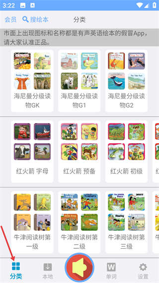 1、分類頁面,展示海尼曼等分級讀物,含牛津閱讀樹系列,提示辨別假冒APP,是查找繪本資源的核心入口。