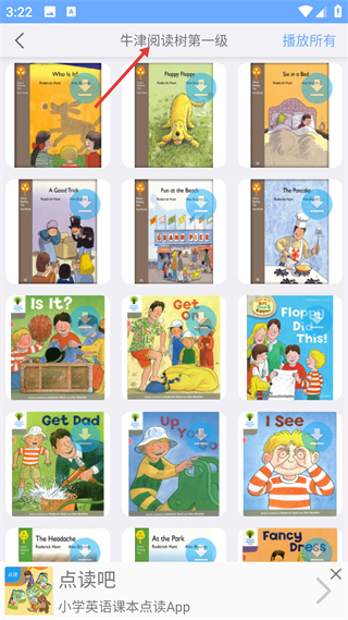 2、牛津閱讀樹第一級頁面,展示Who Is It?等繪本,支持單本下載或播放所有,集中呈現同系列分級閱讀內容。