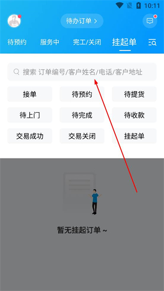 1、進入萬師傅師傅端待辦單頁面,切換到掛起單分類,可通過搜索框查找對應訂單,查看各類訂單狀態分類選項。