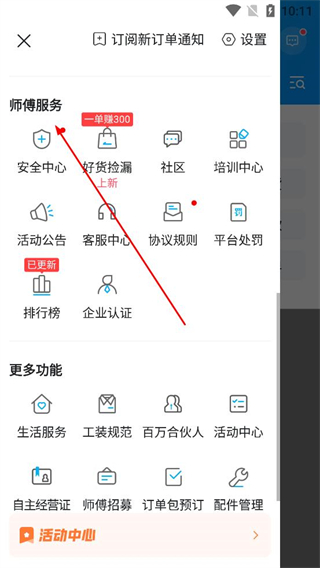 2、打開師傅服務菜單瀏覽安全中心好貨搶賺等功能入口,選擇培訓中心選項,進入對應的學習頁面。