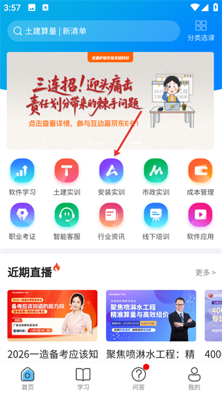 1、首頁,含軟件學習、安裝實訓等功能入口,設近期直播課,支持搜索土建算量,聚焦造價技能培訓。