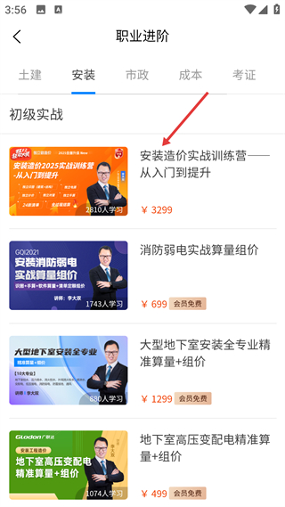 2、職業進階頁,展示安裝造價課程,如實戰訓練營,標價格與學習人數,分階段適配不同技能水平。