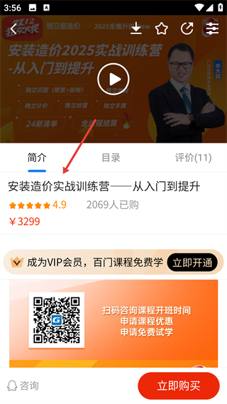 3、課程詳情頁,呈現安裝造價訓練營簡介,評分4.9且2069人已購,支持購買試聽,可掃碼咨詢優惠。