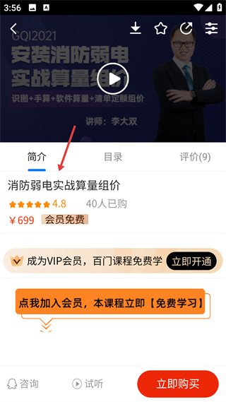 4、消防弱電課程頁,展示實戰算量組價課程,含識圖等內容,價699元且會員免費,支持試聽與購買。