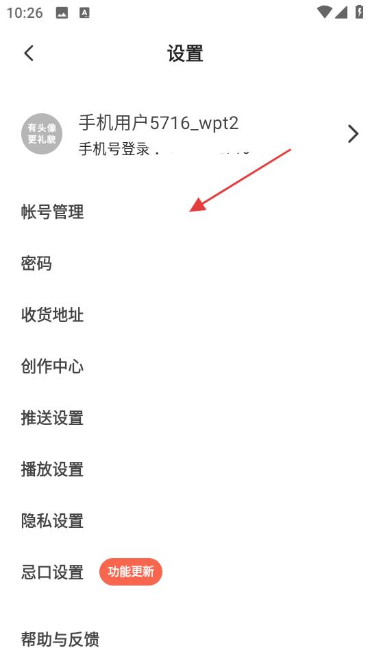 2、設置頁面呈現用戶賬號信息,羅列賬號管理、密碼等多項功能,忌口設置,點擊賬號管理。