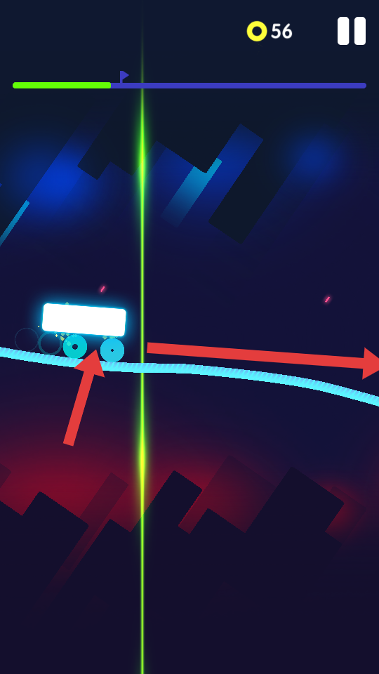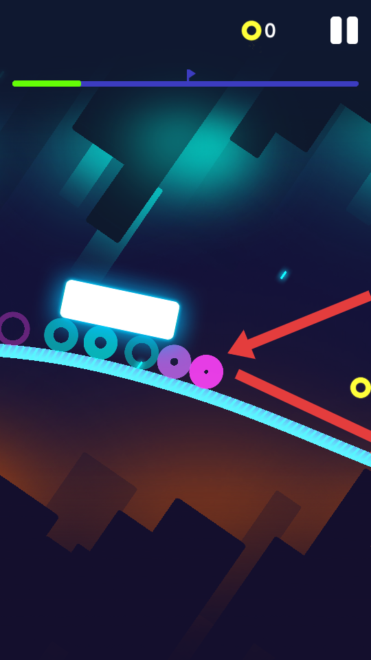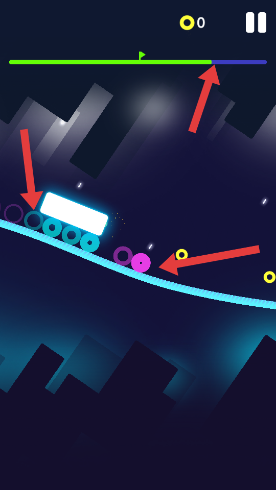 1、操控帶有霓虹車輪的車輛在軌道上前進,收集軌道上的彩色圓環,注意車輛的行進方向,保持平穩行駛。