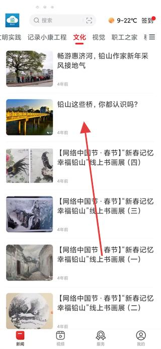 2、登錄后進入新聞頁面瀏覽各類資訊內容,選擇感興趣的文章如鉛山這些橋你都認識嗎點擊進入,可查看文章的詳細內容了解相關信息。