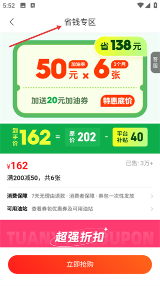 1、省錢專區券包頁,展示50元×6張加油券套餐,含加送券及特惠底價,標注消費保障,助力用戶獲取加油優惠。