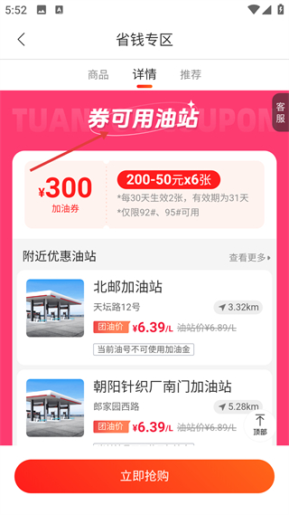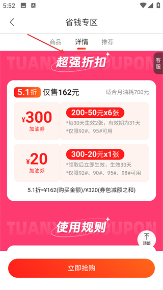 2、券包詳情頁,說明券包折扣、券種及生效規則,明確適用油號,幫助用戶了解券包的具體權益與使用條件。