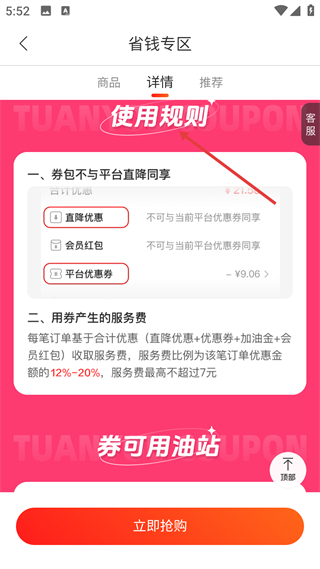 3、券包使用規則頁,說明券包不與其他優惠同享,標注用券服務費比例,清晰界定券包的使用限制與成本。