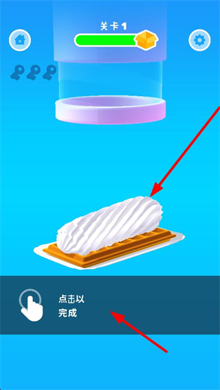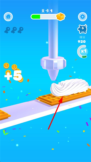 2、持續長按操作,讓裱花工具在華夫餅上擠出奶油,完成裝飾的同時可獲得金幣獎勵,積累關卡得分。