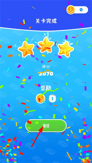 4、關卡完成后,獲得對應的星級評價與得分,此時點擊繼續按鈕,進入下一個關卡繼續挑戰。