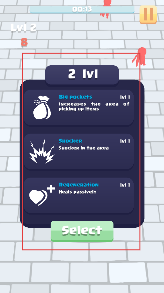 3、戰斗到一定階段,會出現升級選擇界面,可挑選Big pockets,Shocker,Regeneration等不同能力,增強士兵戰力,繼續戰斗。