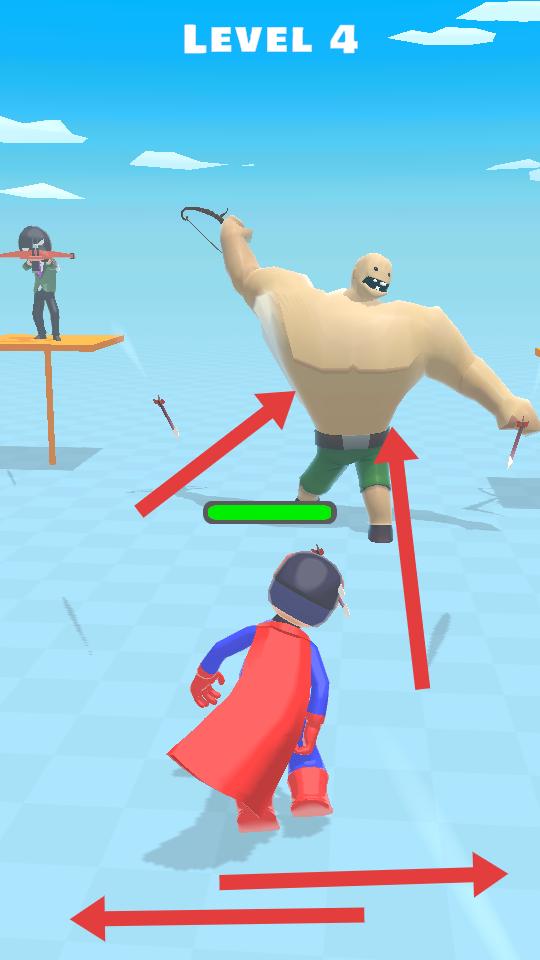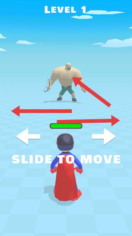 1、進入第一關,操控穿紅披風的角色,通過滑動來移動,面對前方的大塊頭敵人,準備與之展開對戰,開啟挑戰。