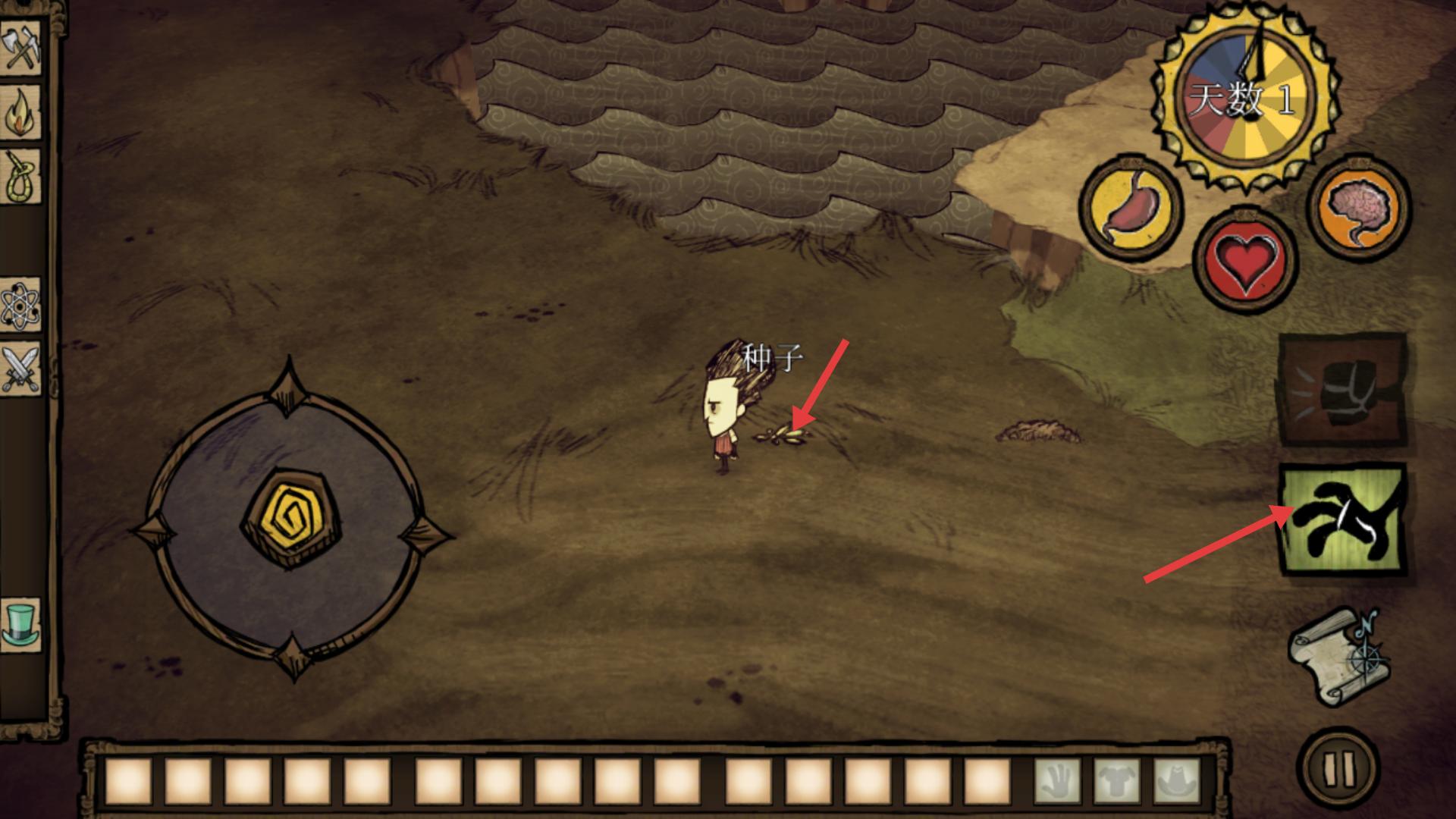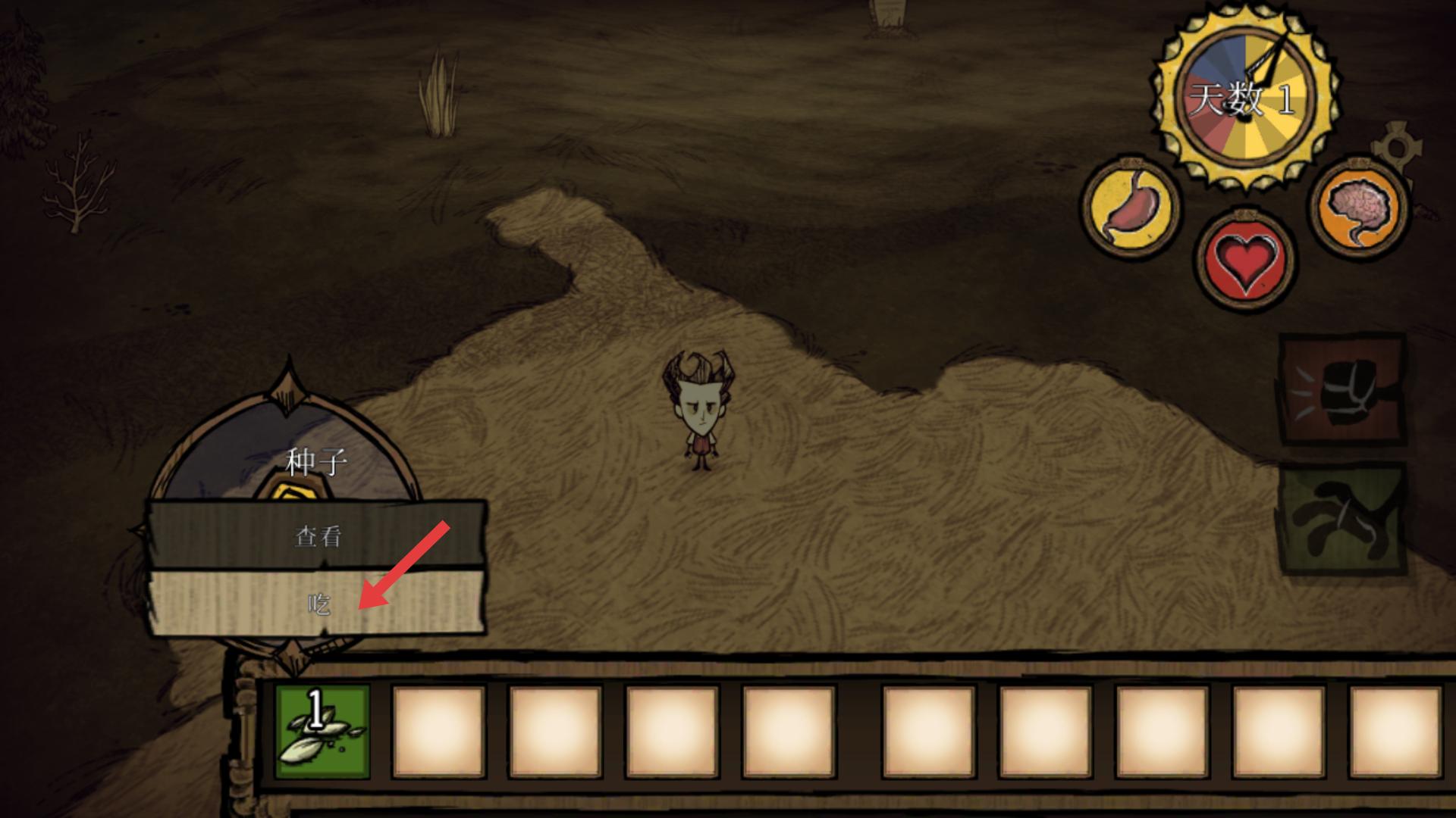 4、當角色饑餓時,打開背包,選擇種子,點擊吃,可補充饑餓值,維持角色生存,確保能繼續在荒野中探索。