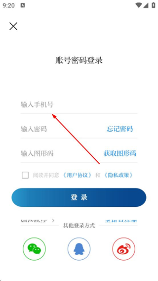 2、在登錄頁面輸入手機號與密碼,獲取并填寫圖形碼,勾選用戶協議和隱私政策后,點擊登錄按鈕完成賬號登錄。