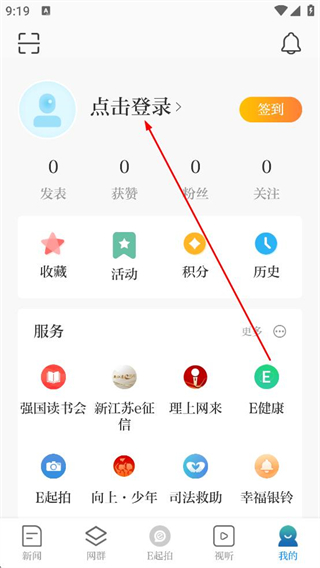 1、打開新江蘇進入我的頁面,點擊點擊登錄選項,進入賬號密碼登錄頁面,準備通過手機號密碼等方式完成賬號登錄。