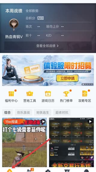 3、和平營地首頁,可查看本周戰績、游戲資訊,使用福利中心、營地工具等功能,獲取游戲動態和輔助工具。