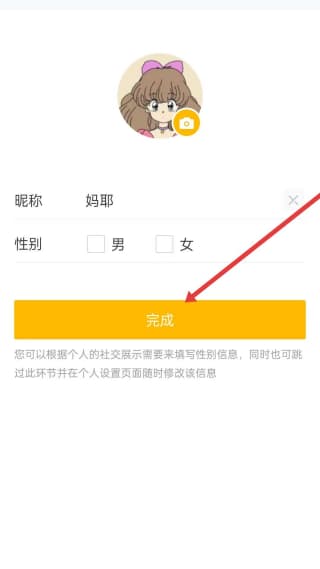 2、個人信息設置頁面,可填寫昵稱、選擇性別,點擊完成,完成個人信息設置。