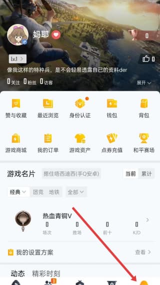 4、進入個人頁面,可查看游戲名片、熱血青銅V等級信息,使用游戲商城、我的訂單等功能,管理個人游戲賬號。