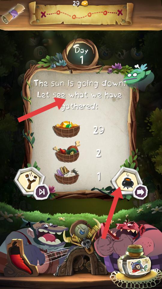 4、當提示The sun is going down時,查看收集到的物品,如金幣,道具等,還可選擇相關功能按鈕,繼續游戲。