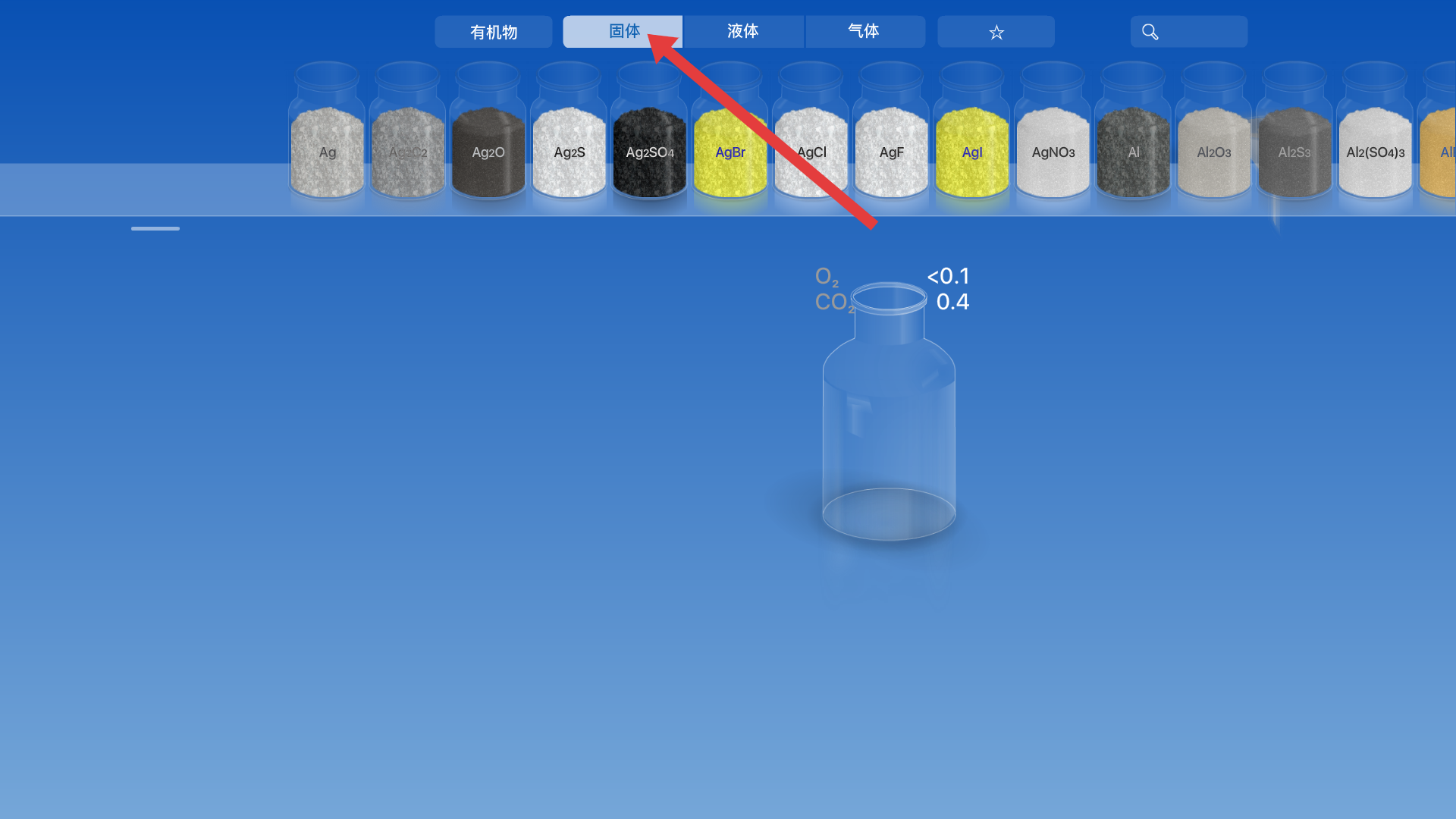 1、試劑分類界面點擊固體標簽,可查看各類固體化學試劑,如Ag、AgO、AgBr等。