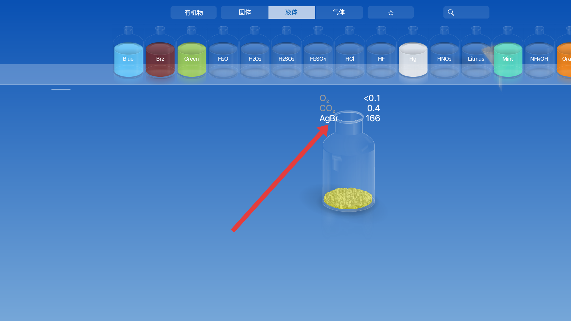 2、點擊液體標簽,可查看各類液體試劑,如HO、HSO、HCl等。