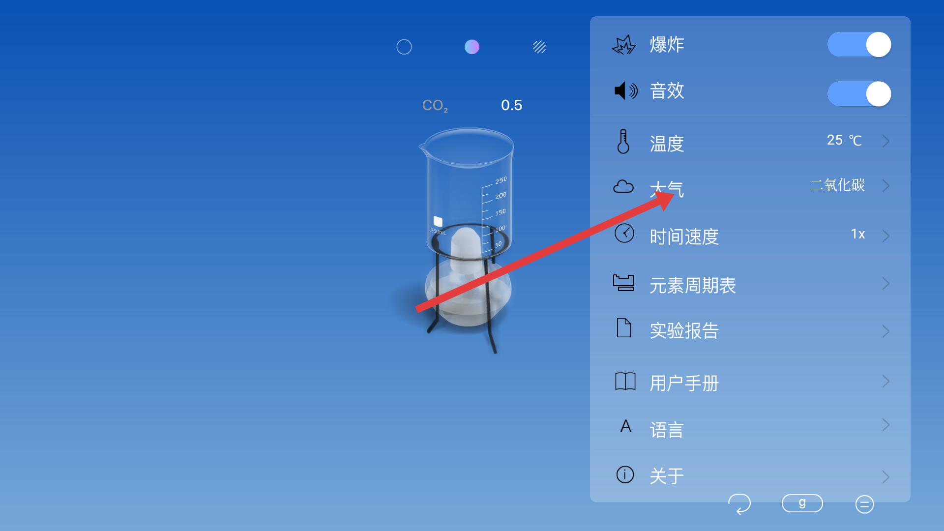 4、設置界面,可調整爆炸效果、音效、溫度、大氣成分如選擇二氧化碳、時間速度等參數,模擬不同實驗環境。