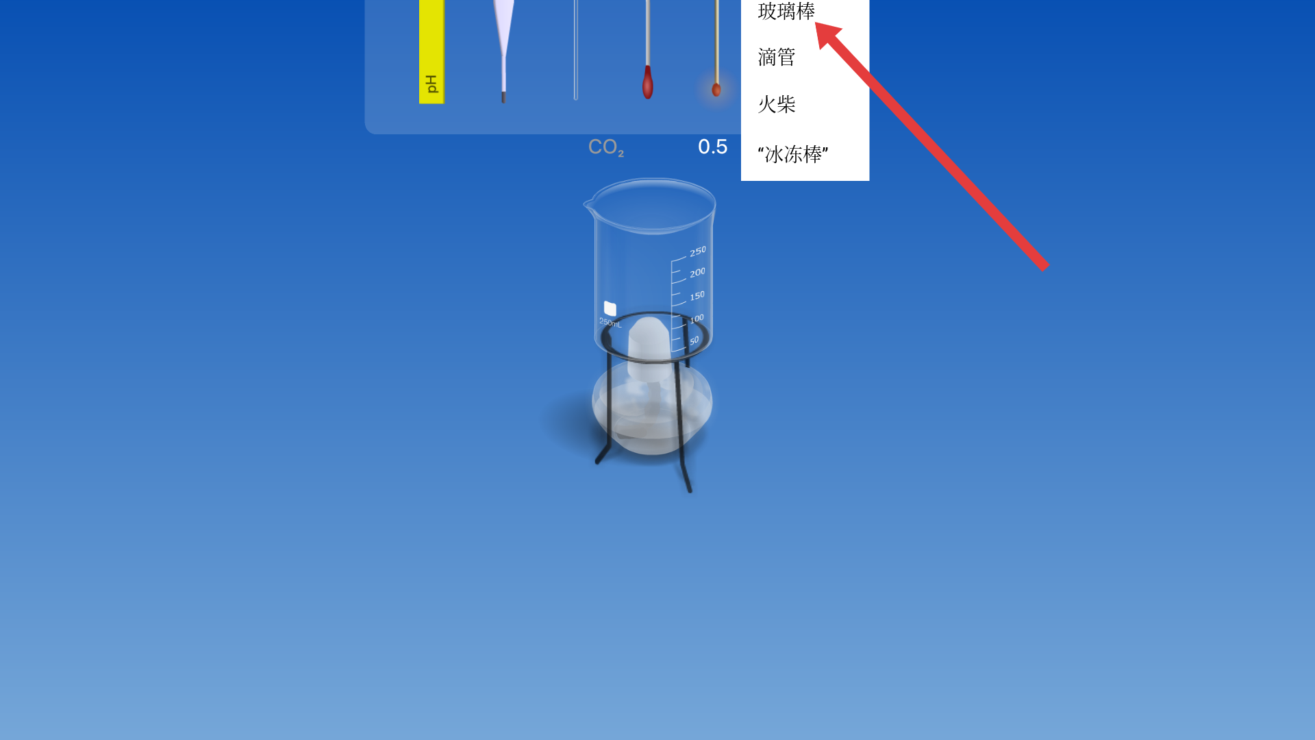 3、儀器補充界面,可選擇玻璃棒、滴管、火柴等工具,輔助實驗操作,如攪拌、滴加試劑、點燃等。
