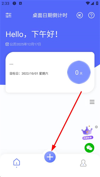 1、進入桌面日期倒計時主界面,顯示當前公歷日期及目標日的倒計時,底部有功能入口,點擊中間加號按鈕可進入登錄相關操作界面。