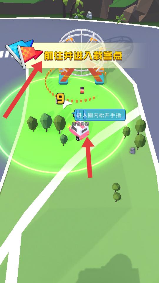 2、駕駛巴士前往載客點,進入圈內松開手指,完成載客,按照提示逐步開展巴士的載客任務,積累乘客。