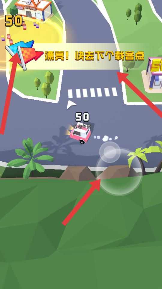 1、搶圈基礎操作:點擊屏幕控制巴士移動至發光圈內,持續占據區域積累乘客數量,被撞擊時按住屏幕觸發瞬間加速抵抗沖擊。