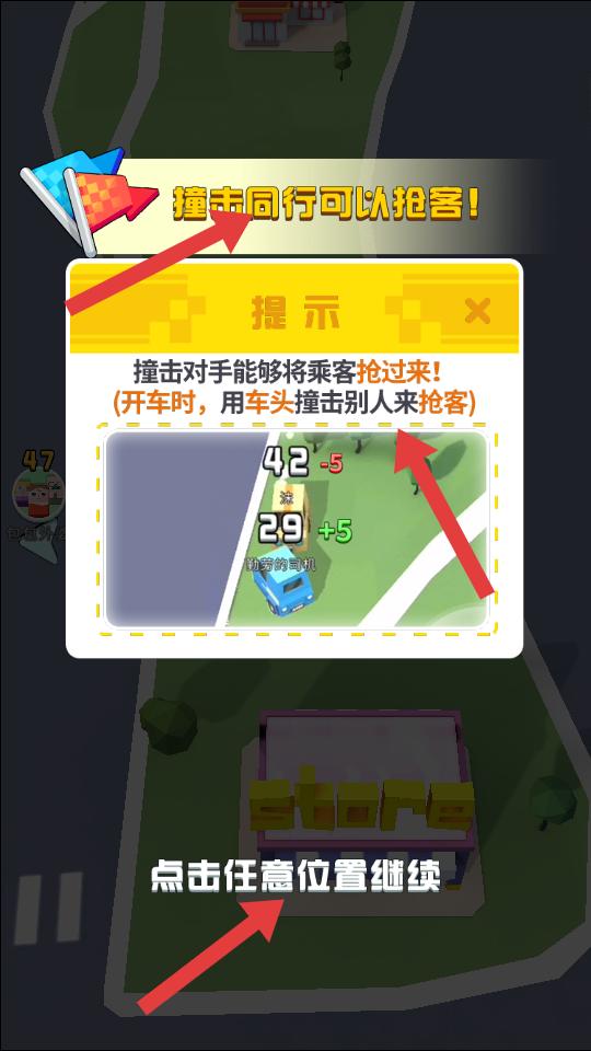 4、游戲中可用車頭撞擊同行巴士搶客,點擊任意位置可關閉提示繼續游戲,通過搶客增加自身乘客數量。