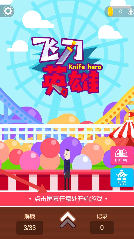 1、進入游戲,點擊屏幕任意處開始,也可查看排行榜,更換時裝,開啟飛刀挑戰,到游樂場風格場景中展開冒險。